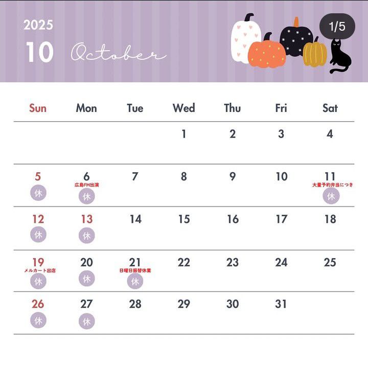 投稿公開日:2025年10月1日 投稿カテゴリー:ブログ 福菜処おたま バイトの松﨑です あっという間の9月でした! 10月は予約のみ営業やイベント出店、 振替のお休みなどありますのでご注意下さい。 行楽シーズンです!お弁当のご予約はLINEが便利です #佐伯区弁当 #佐伯区惣菜屋 #佐伯区ランチ #五日市弁当 #五日市惣菜屋 #五日市ランチ 佐伯区オードブル #五日市オードブル おすすめ 祝1周年★ 2025年8月26日 エアコン故障(´;ω;`) 2025年7月16日 万博 2025年10月5日